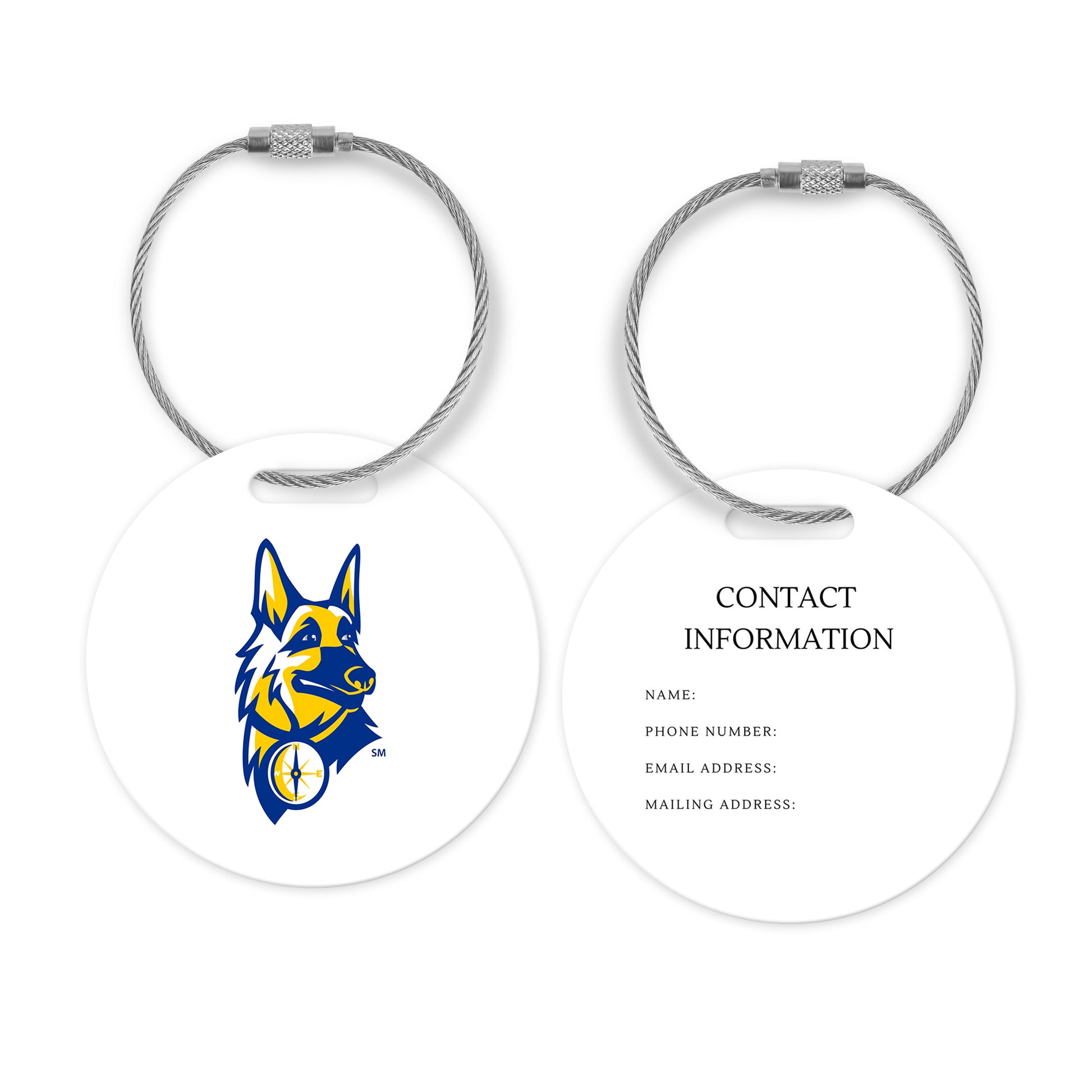 This 4" round metal bag tag has a mascot on one side and is white on the back to write your contact information. The tag attaches to luggage with a durable cable attachment.